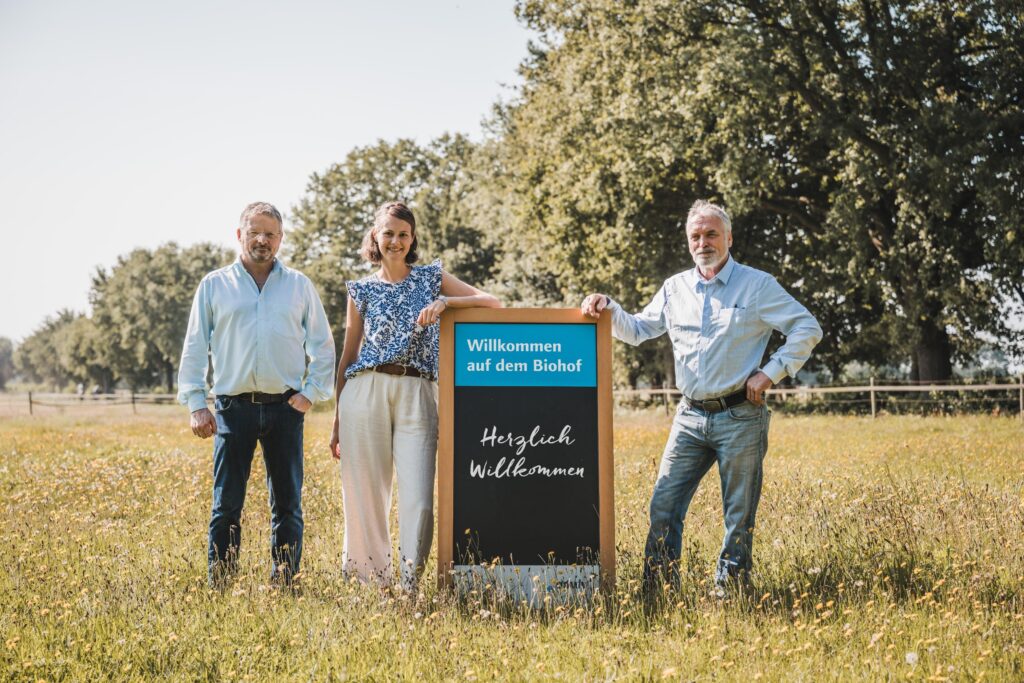 Auf dem Bild von links: Fleischermeister Torsten Selle, Geschäftsführer Bio-Fleischerei und Hofladen, Andrea Hoeber (OOWV), verantwortlich für die Umweltbildung auf dem Biohof, und Landwirtschaftsmeister Gustav Wolters, Pächter des Biohofes